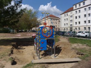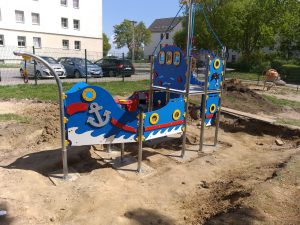 Überall sprießt und blüht es zurzeit in der Natur. Nachdem der Boden frostfrei ist, arbeiten unsere Kollegen an der Gestaltung des Vorplatzes unserer Kita „Emil-Grünbär-Haus“. Ein neuer Zaun fasst nun das Außengelände ein. Neuer Mutterboden wurde auf den Flächen vor dem Eingang eingearbeitet, ein Kletterhügel wurde aufgeschüttet und Rasen gesät. Ganz neu ist das Kinderspielschiff auf der linken Seite vor dem Eingang. In Kürze werden die Wendorfer die Grünbär-Kinder auch vor dem Haus fröhlich spielen sehen.
