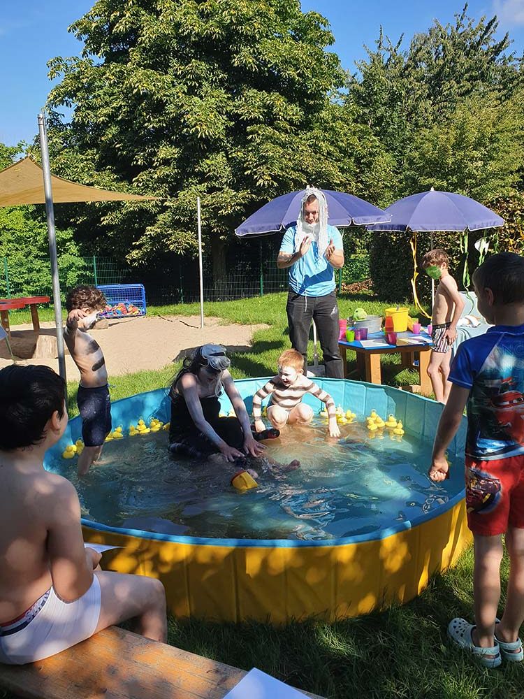 Den letzten Tag der Sommerferien ließen die Hortkinder mit einem Neptunfest ausklingen. Die Kinder wurden von den Helferlein „Diddeldum“ und „Diddeldei“ gefangen um dann von Neptun und Ursula der Meerhexe auf ihren „neuen“ Namen getauft zu werden. Zum Abschluss musste auch die Meerhexe in Wasser steigen.
