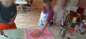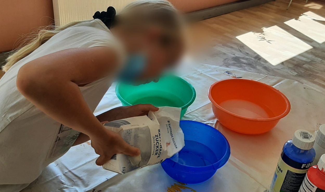 Zuckerkreide wurde hergestellt und großartige Bilder in leuchtenden Farben entstanden. Mit Hilfe von Tortenspitzen, Schwämmen, Schablonen und anderen Materialen, wurden gemeinsam verschiedene Drucktechniken ausprobiert.