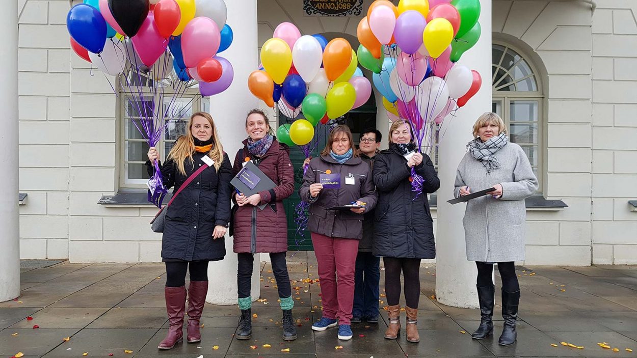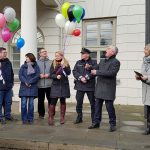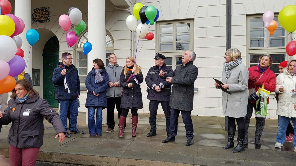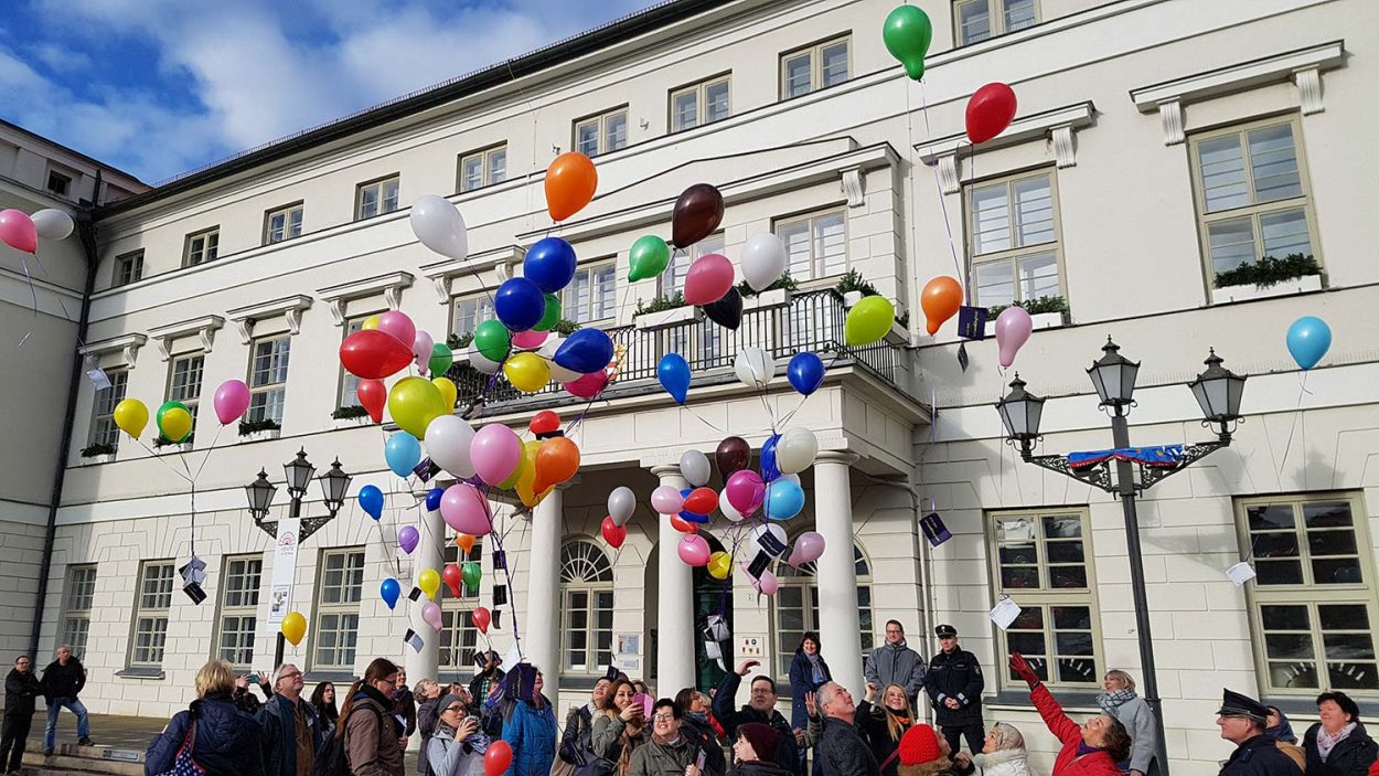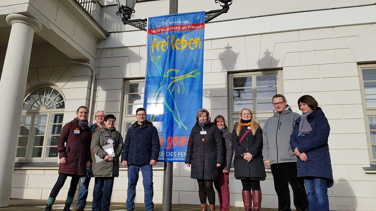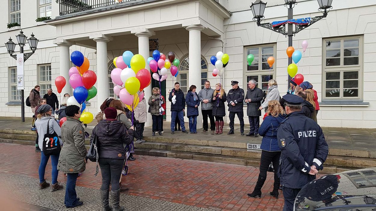 Jährlich wird zum Auftakt der Anti-Gewalt-Woche am 25. November die TERRE DES FEMMES-Flagge „Frei leben-Ohne Gewalt“ gehisst, um ein Zeichen gegen Gewalt an Frauen und Kindern zu setzen. Gemeinsam mit dem Bürgermeister Thomas Beyer, weiteren Vertretern der Hansestadt Wismar, dem AWO Geschäftsführer Matthias Koch, den Kolleginnen des Integrationslotsendienstes, dem Migrationsbeauftragten und den Mitarbeiterinnen des Frauenschutzhauses ließen wir Luftballons mit Botschaften zum Gewaltfreien Leben in den Himmel aufsteigen. Herzlich bedanken möchten wir uns bei der Firma Lechner, die uns für unsere Aktion das Helium für die Luftballons gratis zur Verfügung stellte.
