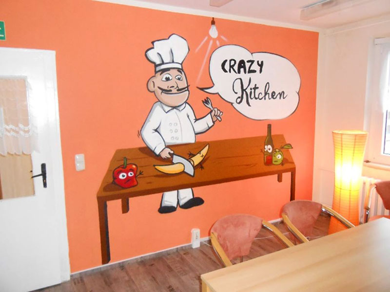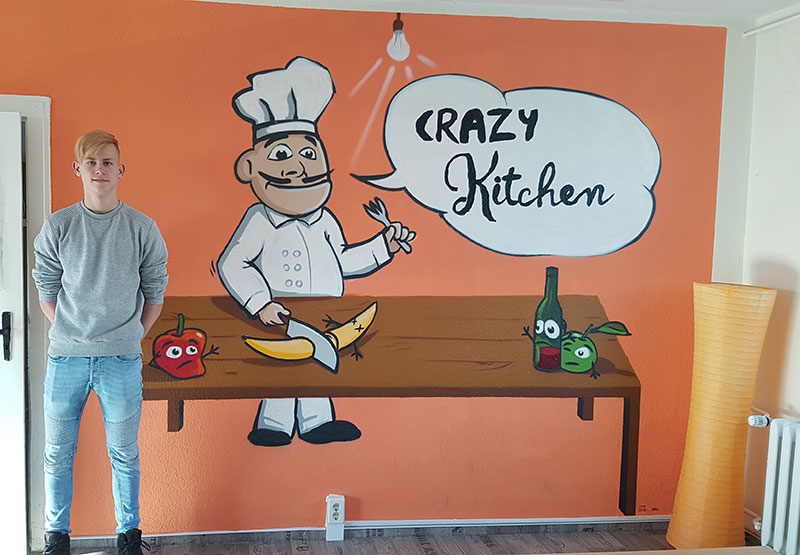Gemeinsam mit dem Experten Christian Pursch nahm der Schüler Aron Reimer aus der 10. Klasse der „IGS Johann Wolfgang von Goethe“ an einem Graffiti Projekt des AWO KV Wismar e.V. teil. Organisiert wurde das Projekt über das Angebot Opti. Diesmal entstand eine phantasievolle Wandgestaltung zum Thema „Gemeinsames Kochen /Restaurant“.