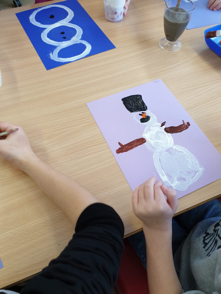 Auch beim Aufwärmen in den Räumen ließ das Thema Schnee die Kinder nicht mehr los, es entstanden viele besondere Schneemänner – mit Pinsel und Farbe gemalt.