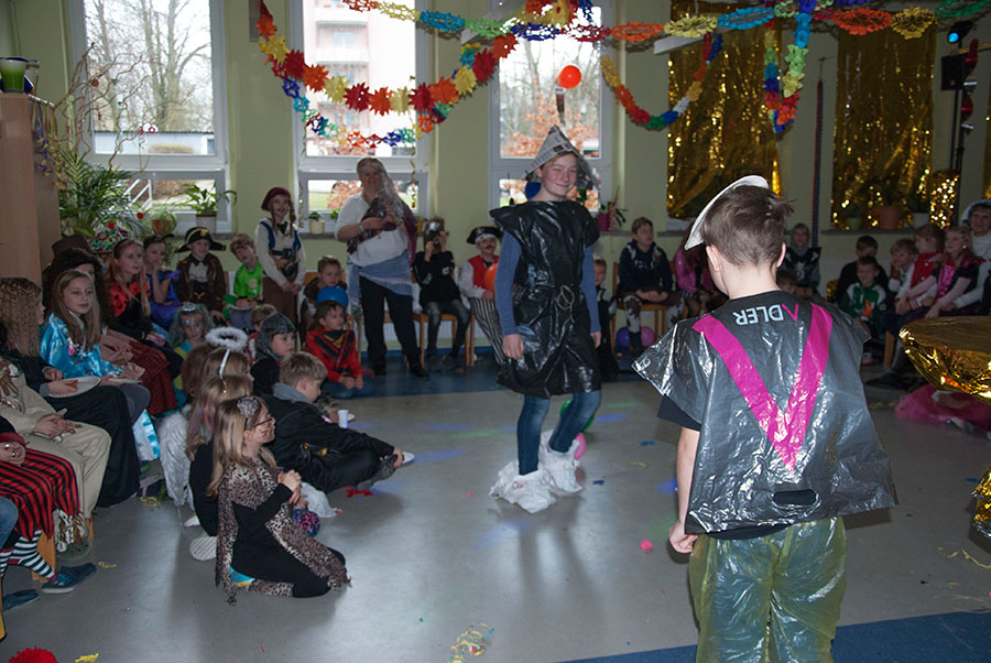 Zum Ausklang des Halbjahres feierten die Grundschüler ihr Faschingsfest. Tatkräftig unterstützten die Eltern der Klasse 4 beim Ausgestalten der Caféteria und beim leckeren Faschingsschmaus. Die 5. und 6. Klasse präsentierte eine Modenschau besonderer Art in englischer Sprache. Die Models führten Kreationen aus Wegwerfprodukten vor. Kleider aus Mülltüten, Schuhe aus Milchverpackungen und Oberteile aus Plastiktaschen waren der Hingucker auf dem Laufsteg. Jeweils zwei Schüler präsentierten einen Walk: einer im Waste-Outfit und einer stellte Material und in englischer Sprache vor. Viel Applaus gab es für dieses Programm. Kinder, Lehrerinnen, Horterzieherinnen und unsere Küchenfee hatten anschließend viel Spaß bei Musik, Tanz und Spielen.