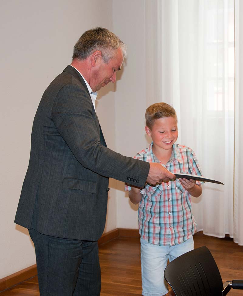 Die Klassenlehrerin, Frau Neumann war sehr stolz auf den Notendurchschnitt von 1,3 ihrer Klasse. Da staunte auch der Bürgermeister und gratulierte jedem einzelnen.