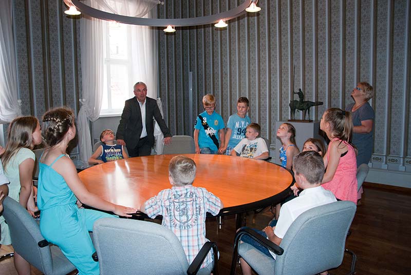 Im Anschluss lud Herr Beyer die Kinder, Frau Neumann und Frau Pawelski, die Horterzieherin, zum Rundgang durch das Rathaus ein. Die Kinder durften auf dem Stuhl des Bürgermeisters sitzen, besichtigten das Tapetenzimmer und den Bürgerschaftssaal. Viele schlaue Fragen beantwortete Herr Beyer geduldig und erzählte den Kindern viele interessante Dinge aus der Stadtgeschichte.