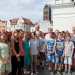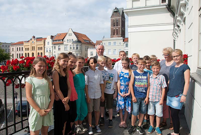 Zum Abschluss durfte die kleine Abordnung der Freien Schule Wismar sogar auf den Rathausbalkon, wo der Bürgermeister sich auch die Zeit für Sonderfotos mit den Kindern nahm.